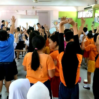 “大笑瑜伽",让孩子们“动起来”,先让手举起来,一只脚放前,然后深呼吸然后大笑(哈哈哈哈哈哈哈~~),简单的一系列动作主要是把负能量排出来,提升體內含氧量,也能提升情緒智能及逆景智能,进而促進身體健康。